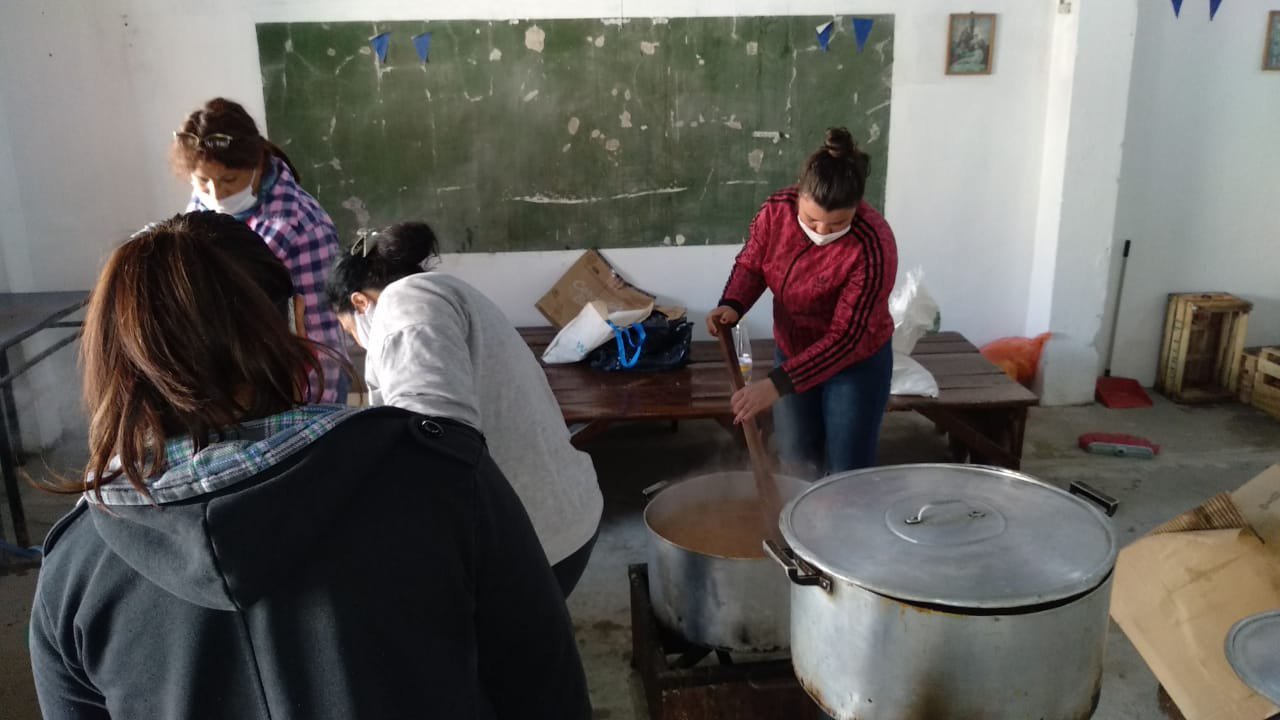 Cada comunidad prepara viandas para unas doscientas personas. Y en cada una de ellas se combina la experiencia un grupo de dos o tres mujeres adultas, que saben de cantidades y recetas, con algunos jóvenes que se encargan de las labores más pesadas.