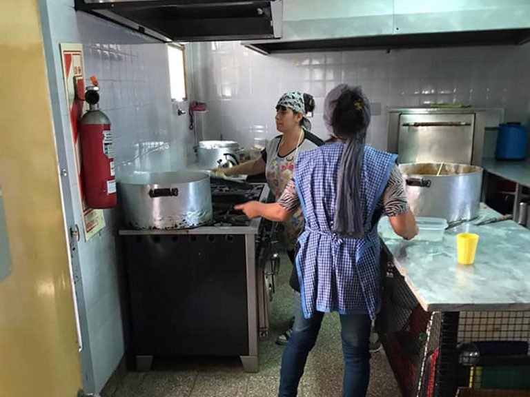 “La gente la está pasando muy mal”, comenta el padre Fabián. Y agrega: “Cada día recibimos a más gente que viene a anotarse. Tratamos de hacer una comida sustanciosa y caliente. La gente llega a la puerta, entregamos con bandejas y cubiertos descartables, la apoyamos en una mesa y la gente la retira, pero no se puede comer adentro”.