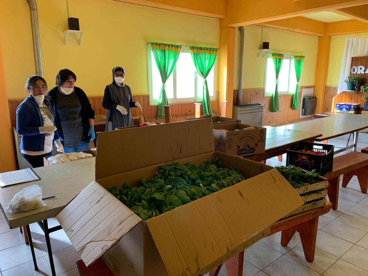 Allí, las Hijas de María Auxiliadora sostienen la entrega de bolsones de comida a numerosas familias. Cumpliendo con las medidas de prevención sanitaria requeridas, las verduras se sumaron a la canasta de alimentos secos que se reparten a las familias de manera regular, y que en este contexto han visto sus pocos ingresos desaparecer al frenar la actividad económica.